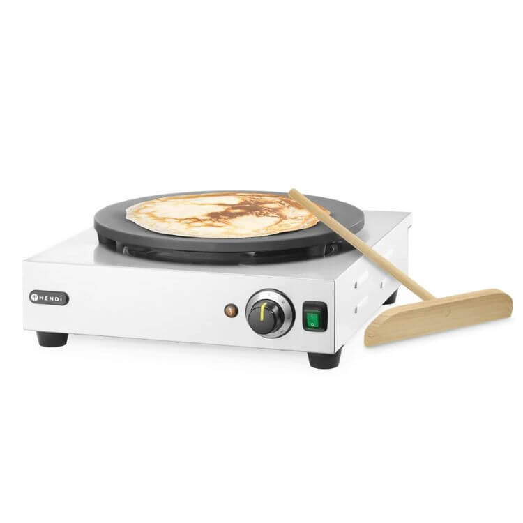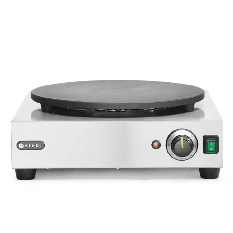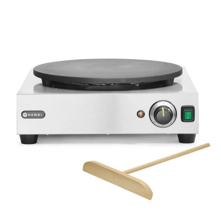 Crêpière professionnelle HENDI avec plaque en fonte de 400 mm et revêtement céramique. Chauffe homogène, thermostat réglable de 50 à 300 °C, protection contre la surchauffe et châssis inox robuste. Livrée avec raclette en bois.