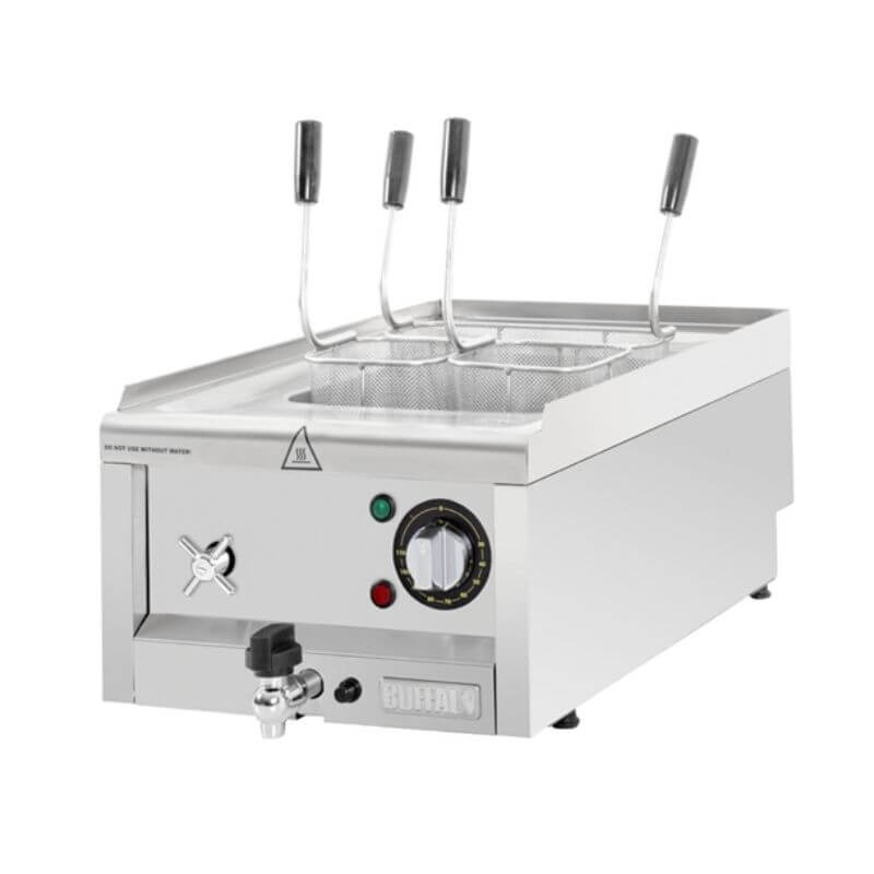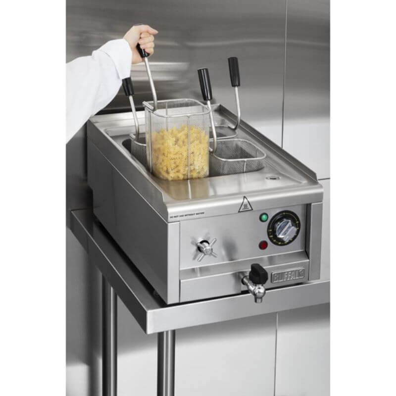 Compact et puissant, le cuiseur à pâtes électrique Buffalo Série 600 est l’équipement idéal pour cuire pâtes, nouilles, légumes ou raviolis dans toutes les cuisines professionnelles. Avec son réservoir de 15 litres, ses 3 paniers inox et son contrôle de température précis, il garantit une cuisson parfaite sur commande.