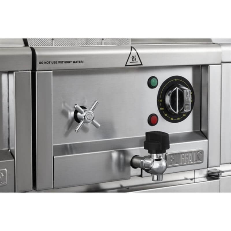 Son réservoir de 15 litres, conçu en acier inoxydable résistant à la corrosion, permet de cuire efficacement des pâtes, nouilles, légumes, raviolis ou même du riz. Grâce à son raccordement à l’eau (3/4″) et son robinet de commande frontal, le remplissage est rapide et pratique. L’évacuation se fait tout aussi facilement grâce à un robinet de vidange situé à l’avant.