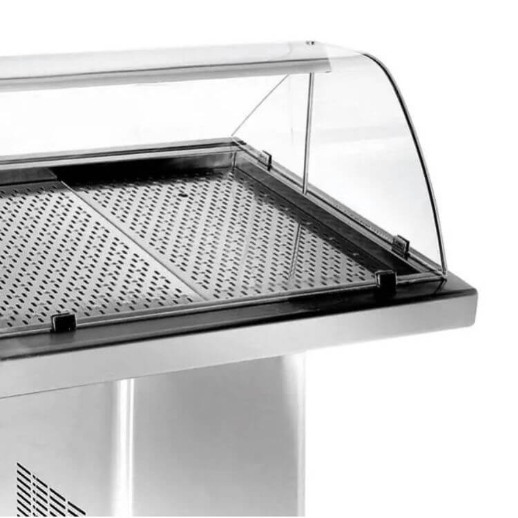 Cette vitrine réfrigérée de 1,44 mètre de large associe un système de froid statique performant (-5°C) et une construction ultra-robuste en acier inoxydable AISI 304. Équipée d’une élégante vitre courbe et d’un éclairage LED, elle met en valeur votre étal tout en facilitant le service grâce à ses portes coulissantes en plexiglas côté vendeur. Un meuble mobile sur roulettes et « prêt à brancher » pour un déploiement immédiat.